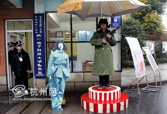 杭电校门口,该校一名学生以雷锋装站岗,以此唤起大家对雷锋的记忆。